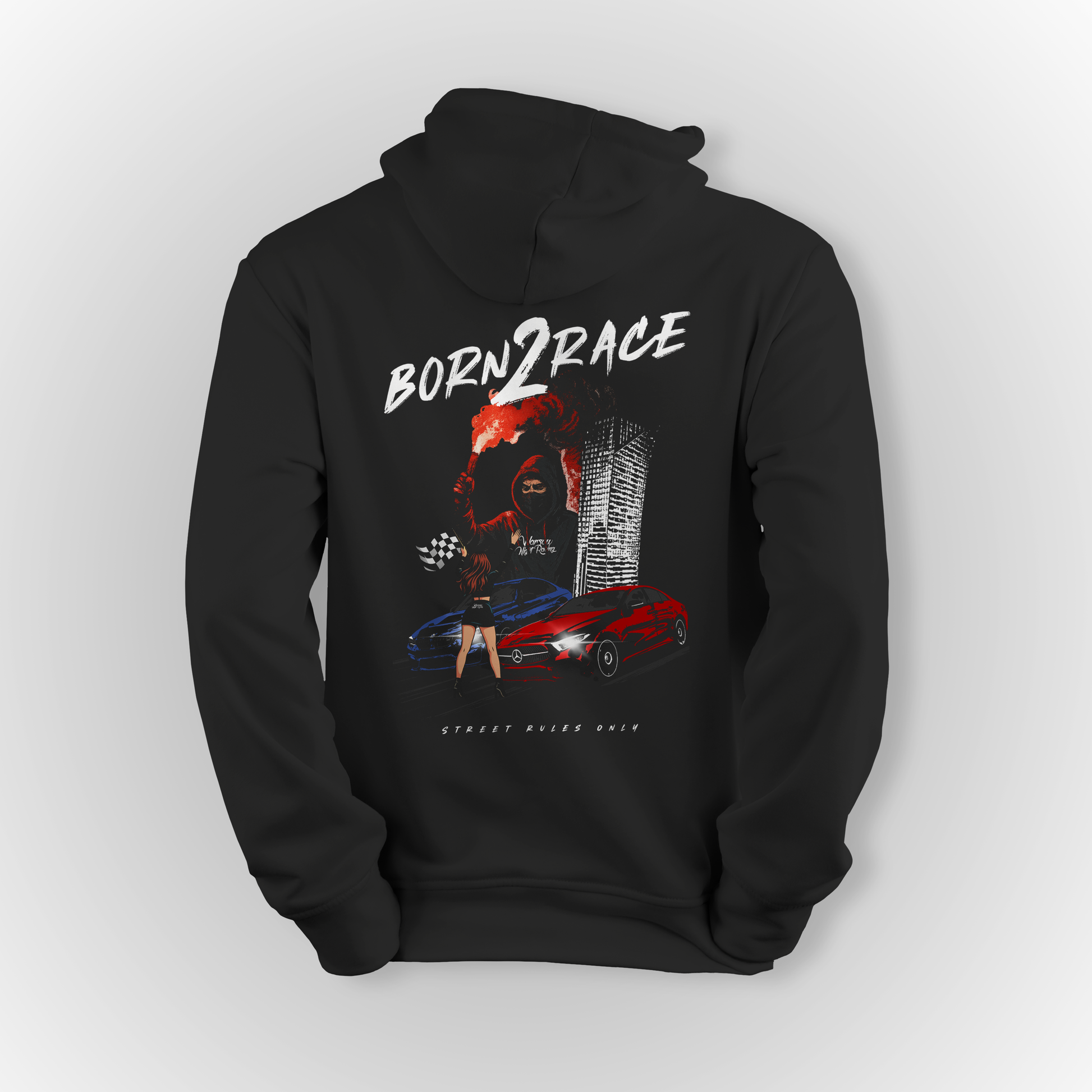 Minimalistyczna bluza z kapturem w kolorze czarnym lub białym, z małym nadrukiem Born2Race na piersi i grafiką z tyłu. Prosty, lecz wyrazisty design idealny dla fanów motoryzacji i ulicznego stylu. Wysokiej jakości bawełna zapewnia komfort noszenia, a klasyczny krój pasuje zarówno do codziennego outfitu, jak i wieczornego cruise'u po mieście.